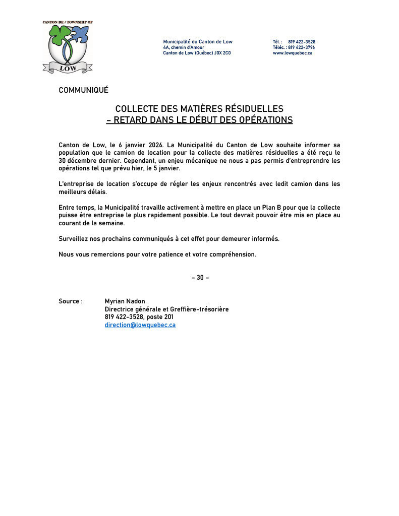 Communiqué - Collecte des matières résiduelles - Retard dans le début des opérations